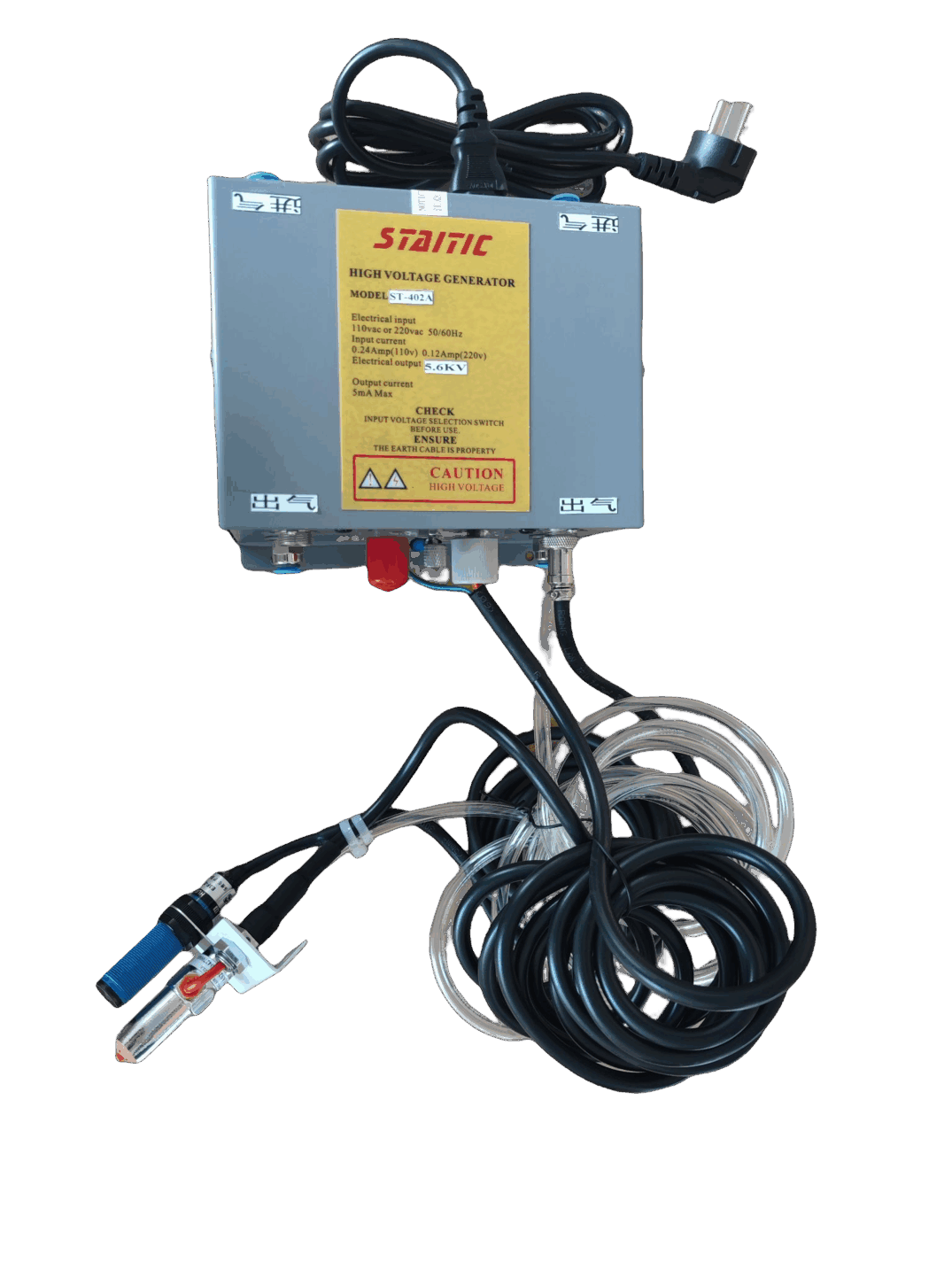 將風(fēng)嘴連接線末端插入高壓發(fā)生器高壓輸出插孔,順時(shí)針旋轉(zhuǎn)到頭,然后將風(fēng)嘴連線的接地線連接到高壓發(fā)生器外側(cè)的接地柱上,并確認(rèn)接地良好后,將高壓發(fā)生器的電源插頭插入帶有接地線的插座上(注意高壓發(fā)生器的使用電壓),將風(fēng)嘴固定安裝到合適的位置,插上壓縮氣管,打開(kāi)高壓發(fā)生器電源即可工作。